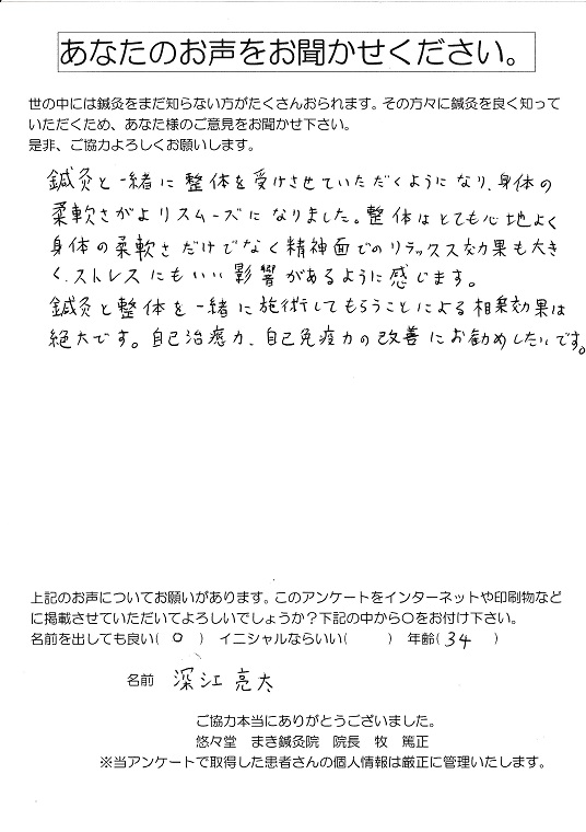 鍼灸都一緒に整体をうけさせていただくようになり、