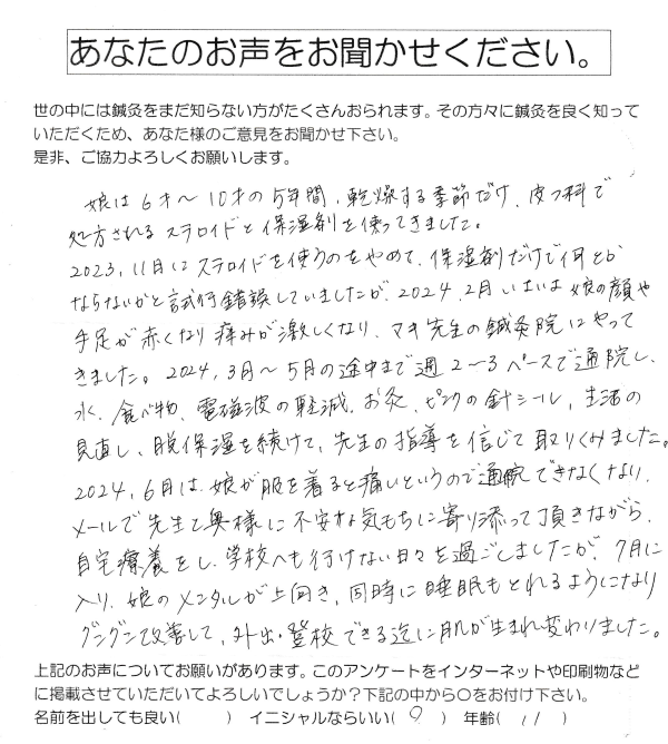 2024年、6月には、娘が服を着ると痛いというので、通院できなくなり、メールで先生と奥さまに不安な気持ちに寄り添っていただきながら、自宅療養をし、学校にも行けない日々を過ごしましたが、7月に入り、娘のメンタルが上向き、同時に睡眠wも取れるようになり、ぐんぐん改善して、外出・登校できるまでに肌が生まれ変わりました。