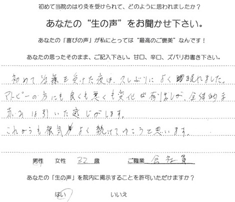 初めて、治療を受けた夜は久しぶりによく眠れました。